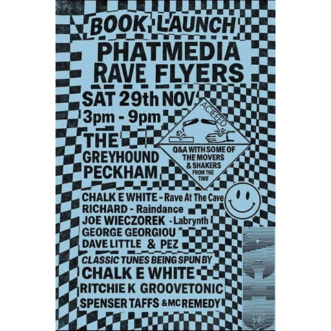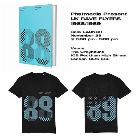 Join us at The Greyhound in Peckham on 29/11/25 for the launch of 'Phatmedia Presents UK Rave Flyers 1988/1989' A stunning coffee table book celebrating the golden years of rave! Our limited edition T shirt will also be available on the day! This event brings together promoters and designers behind the original flyers featured in the book for a Q&A exploring the early rave scene, the DIY spirit of the artwork, and the movementโs lasting cultural impact. Followed by a night of classic acid house