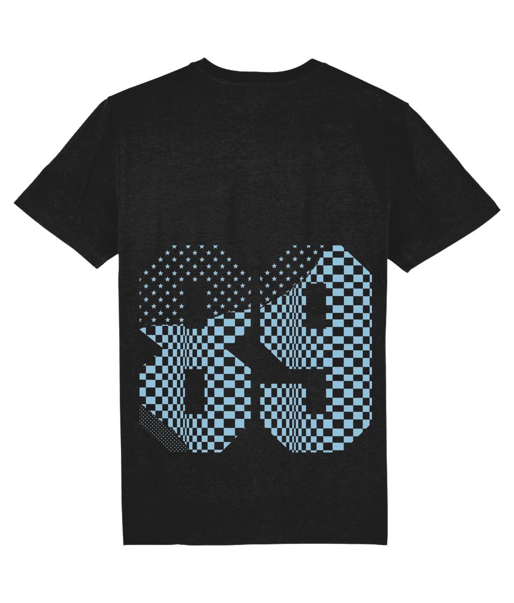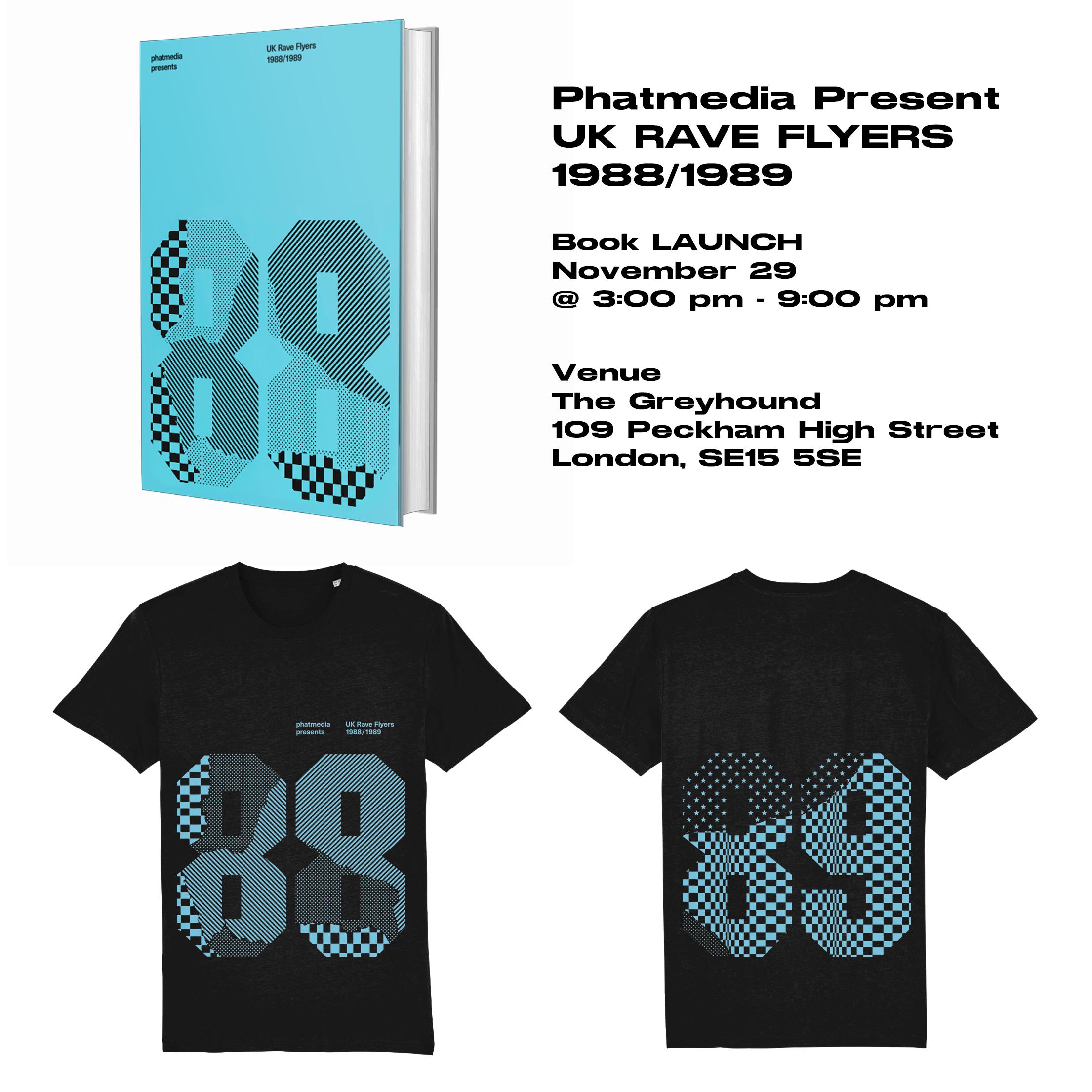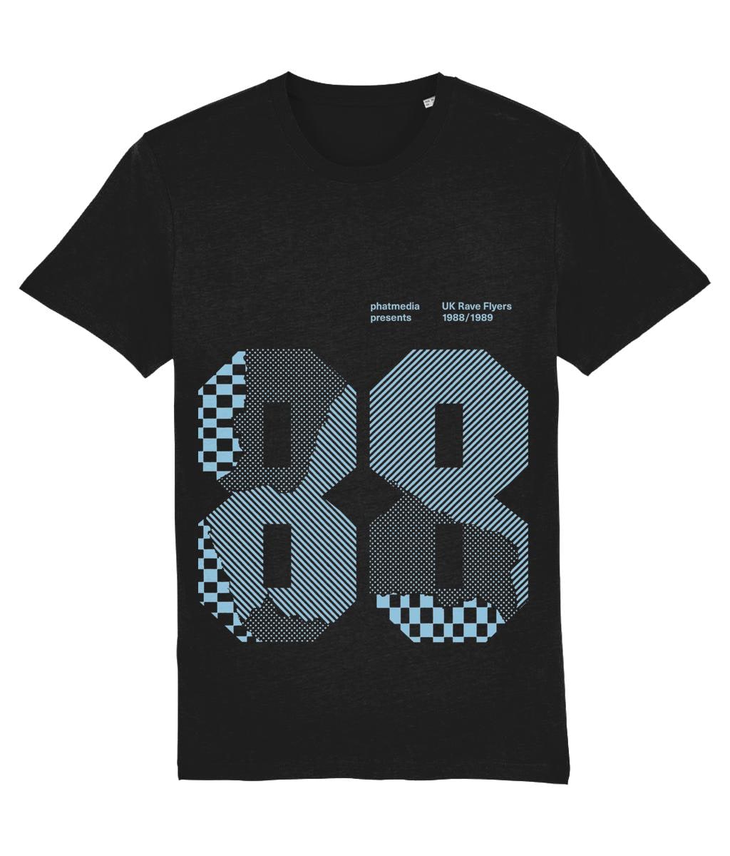 Phatmedia Presents UK Rave Flyers 1988 - 1989 Tee Shirt in black with 88, 89 front and back print in blue.
